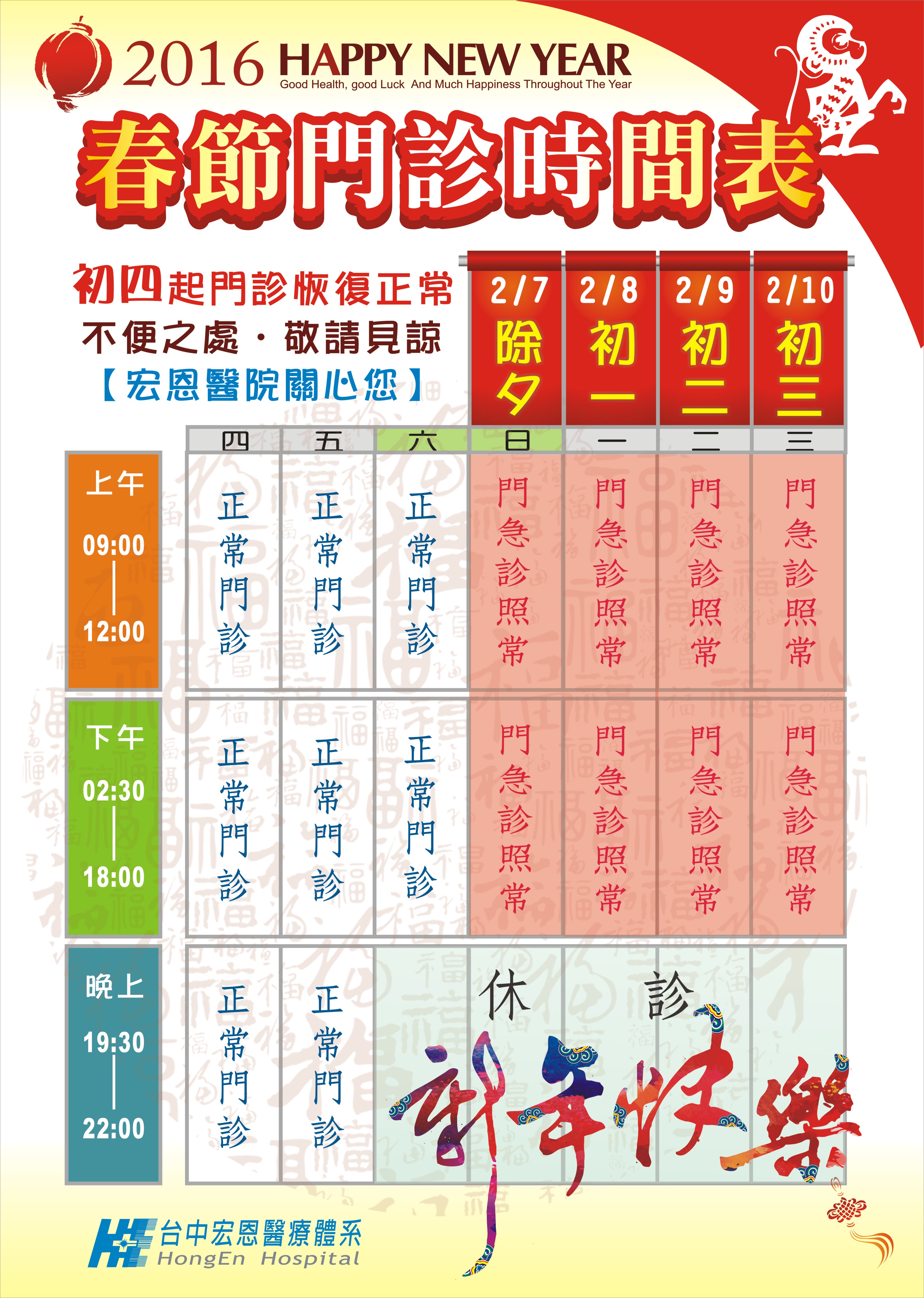 猴年行大運!!!!~宏恩醫院從除夕到初三晚間六點前 ,都有門急診的服務唷~