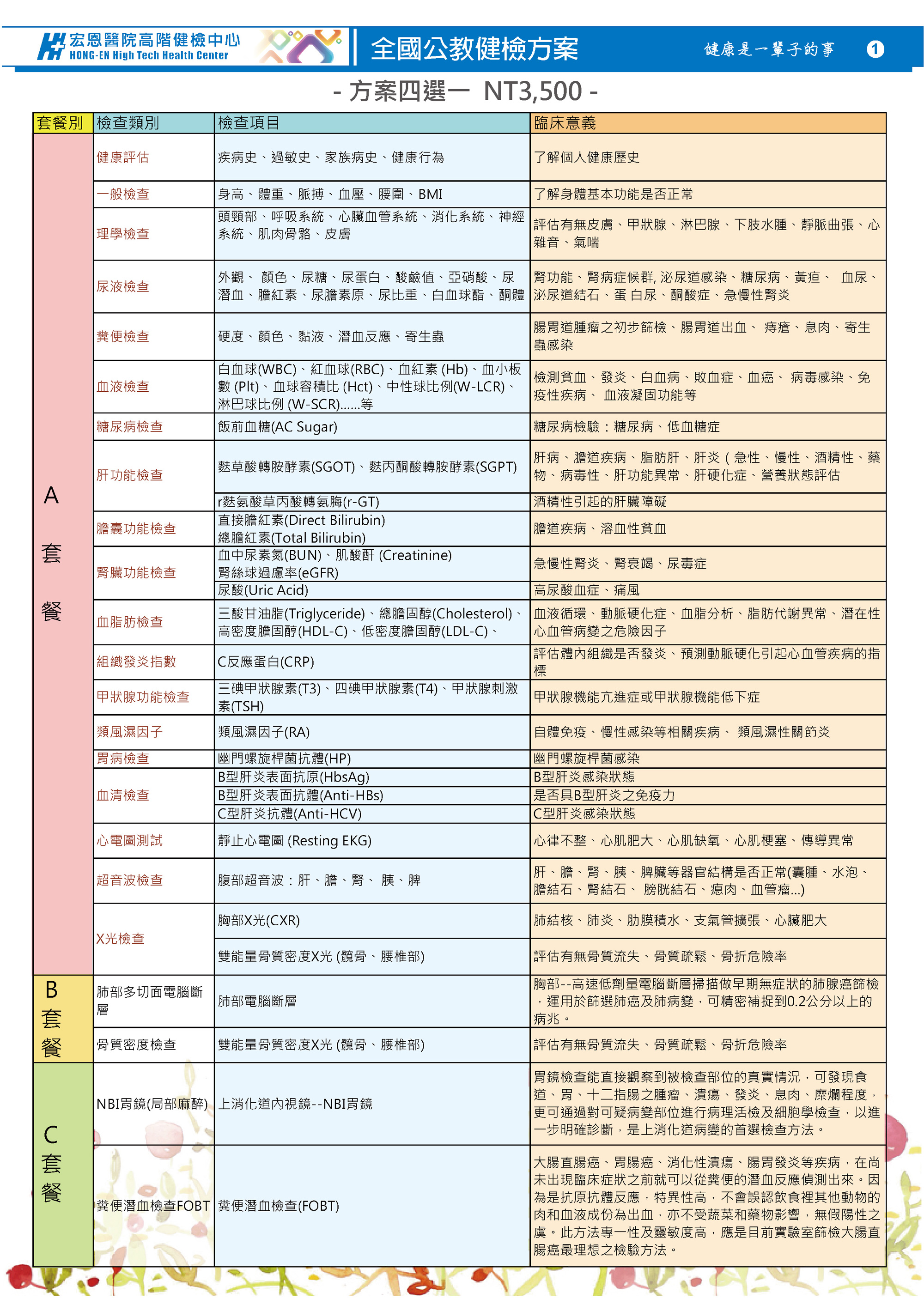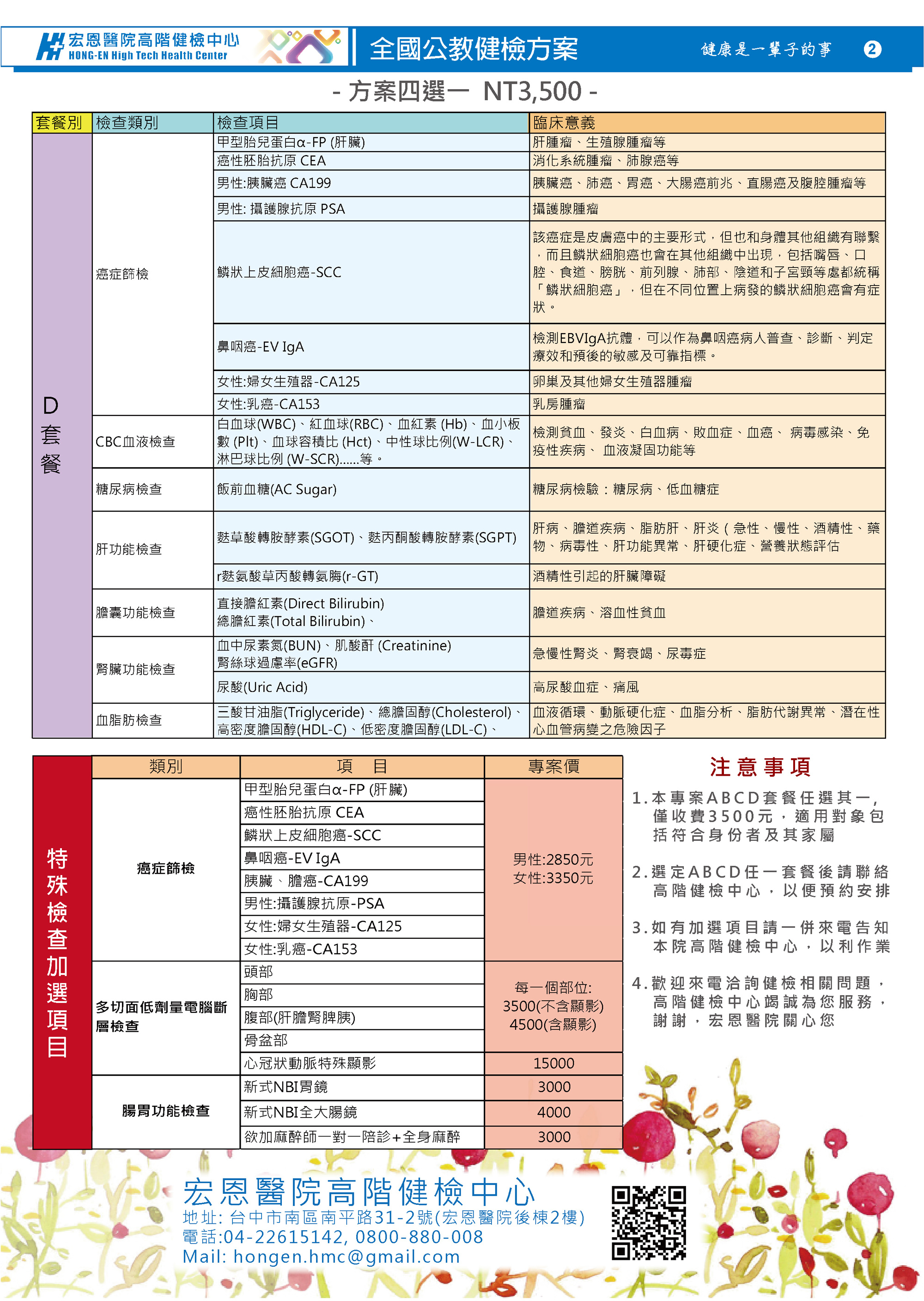 公教人員看過來~~全國公教健檢方案出爐囉,只要您攜帶識別證等證明文件即可參加本專案喔,除了一般坊間做的常規檢查,健檢中心特別規劃出4款套餐,不論是需要電腦斷層掃描或者是NBI內視鏡檢查,都能選擇喔~~~宏恩醫院高階健檢中心 0800-880-008