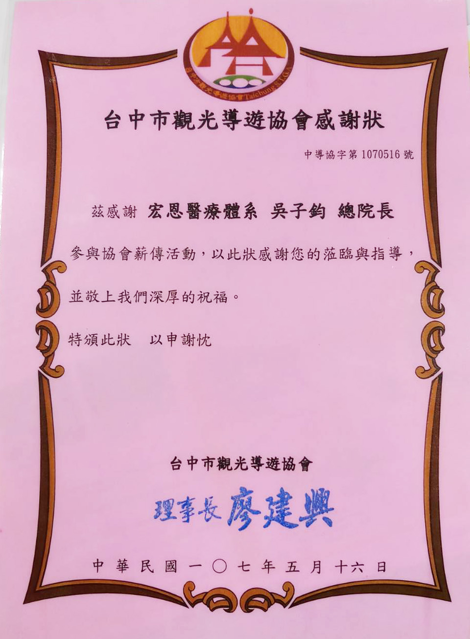 5月16日晚上,吳總院長受邀前往觀光導遊協會演講,主題除了預防醫學的倡導及高階健檢儀器的介紹外,加入了"旅遊緊急意外處理"主題,舉凡高山症、潛水夫症、毒蛇、虎頭蜂、恙蟲咬傷及外傷骨折等常見的症狀處理、讓現場的好朋友們收益良多,最後也謝謝協會給我們的支持與肯定。