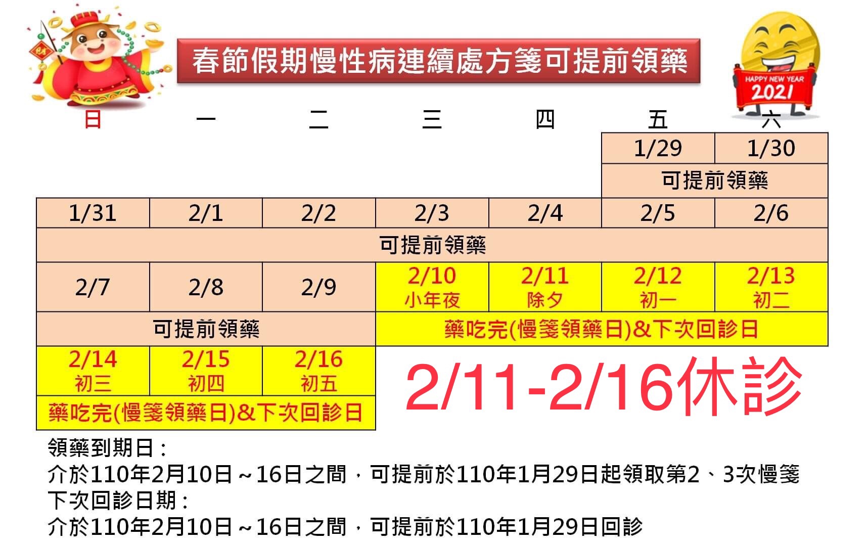 因應7天(2/10-2/16)春節假期,避免慢性病患用藥中斷,健保署放寬領藥日提前至春節前10天,原本慢性病連續處方箋領藥最後日期落在春節期間的民眾,從110年1月29日起可提前領藥。
