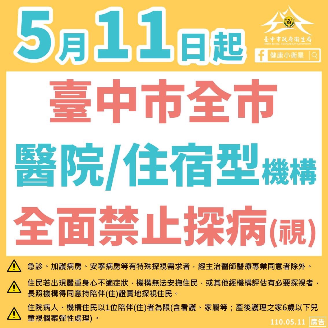 因嚴重特殊傳染性肺炎疫情升溫,5月11日起臺中市醫院及住宿型機構